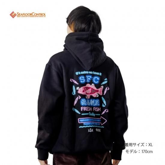 ”IF IT SWIMS WE HAVE IT”=海に泳いでる魚ならなんでも提供というキャッチコピーとジギングの人気魚種であるアカムツとSFCの海底制圧を香港街のシーフードレストランのネオンをイメージしCOOLかつ、DYNAMICな落とし込みは、デイリーユースとしても着用できるパンチのあるデザインです。